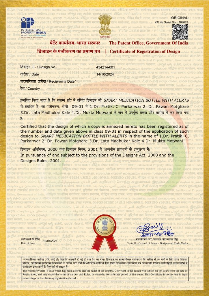 A Patent has been granted to the patentee, Dr. Pratik Parkarwar Dr. Pawan Motghare Dr. Rupali Mhaske Dr. Lata Kale & Dr. Mukta Motwani Device Design titled: ‘Smart Medication Bottle with Alerts’ from The Patent Office, Government of India 434214-001 dated on 13/01/2025
