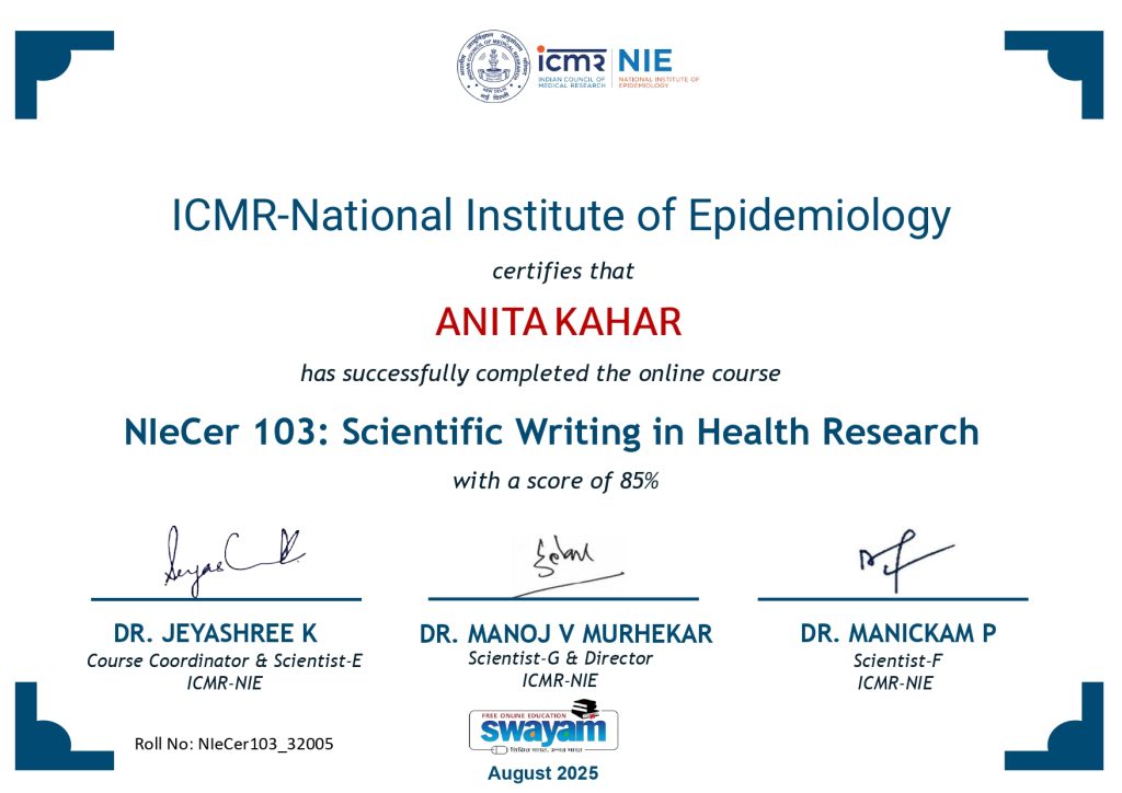 Dr. Anita Kahar, Lecturer, Dept. of Prosthodontics, Ranjeet Deshmukh Dental College and Research Centre, Nagpur successfully completed the ICMR-NIE online course on ‘Scientific Writing in Health Research’ from SWAYAM – a Government of India portal supported by the Ministry of Education in August 2025.