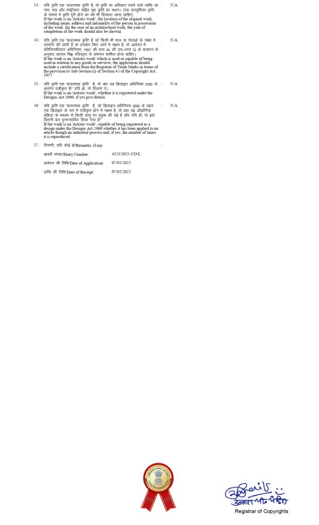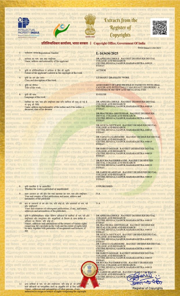 Dr. Apeksha Dhole, Professor, Dr. Pratiksha Ghotkekar, MDS 2nd year, Dr. Mukta Motwani, Professor & HOD, Dr. Tapasya Karemore, Reader, Dr. Smriti Golhar, Reader, Dr. Rucha Pandhripande, Senior Lecturer, Dr. Zareesh Akhtar, Senior Lecturer, Department of Oral Medicine & Radiology, Ranjeet Deshmukh Dental College & Research Centre, Nagpur received copyright L-163436/2025 dated on 11/04/2025 of titled ‘Assessment of Lipid Profile in Patients with Oral Cancer and Potentially Malignant Disorders – A Systematic Review and Meta-Analysis.’
