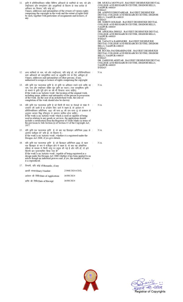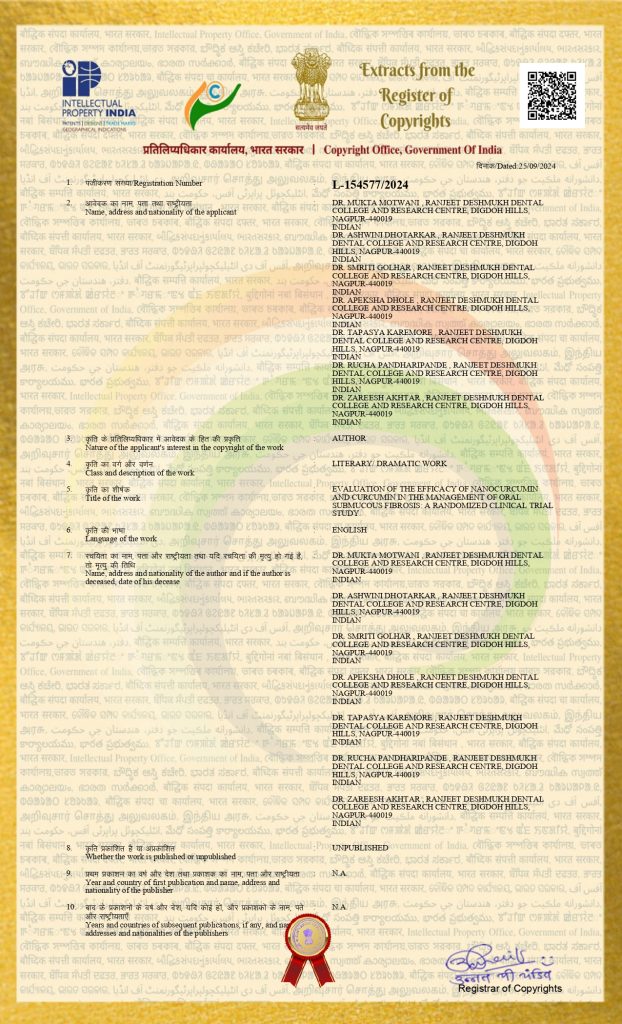 Dr. Mukta Motwani, Professor & HOD, Dr. Ashwini Dhotarkar, MDS 3rd year, Dr. Smriti Golhar, Reader, Dr. Apeksha Dhole, Professor, Dr. Tapasya Karemore, Reader, Dr. Rucha Pandharipande, Senior Lecturer, Dr. Zareesh Akhtar, Senior Lecturer, Department of Oral Medicine & Radiology, Ranjeet Deshmukh Dental College & Research Centre, Nagpur received copyright L-154577/2024 dated on 25/09/ 2024 of titled ‘Evaluation of the efficacy of nanocurcumin And curcumin in the management of oral submucous fibrosis: a randomized clinical trial study’.