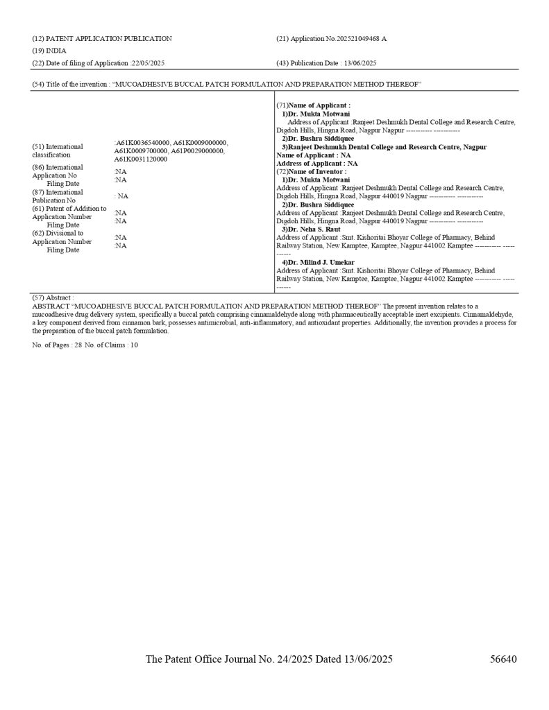 A Patent has been granted to the patentee, Dr. Mukta Motwani Dr. Bushra Siddiquee Dr. Neha Raut & Dr. Milind Umekar Device Design titled: ‘Mucoadhesive buccal patch formulation and preparation method thereof’ from The Patent Office, Government of India 202521049468 A dated on 13/06/2025