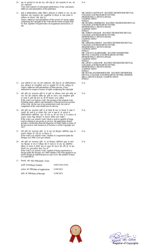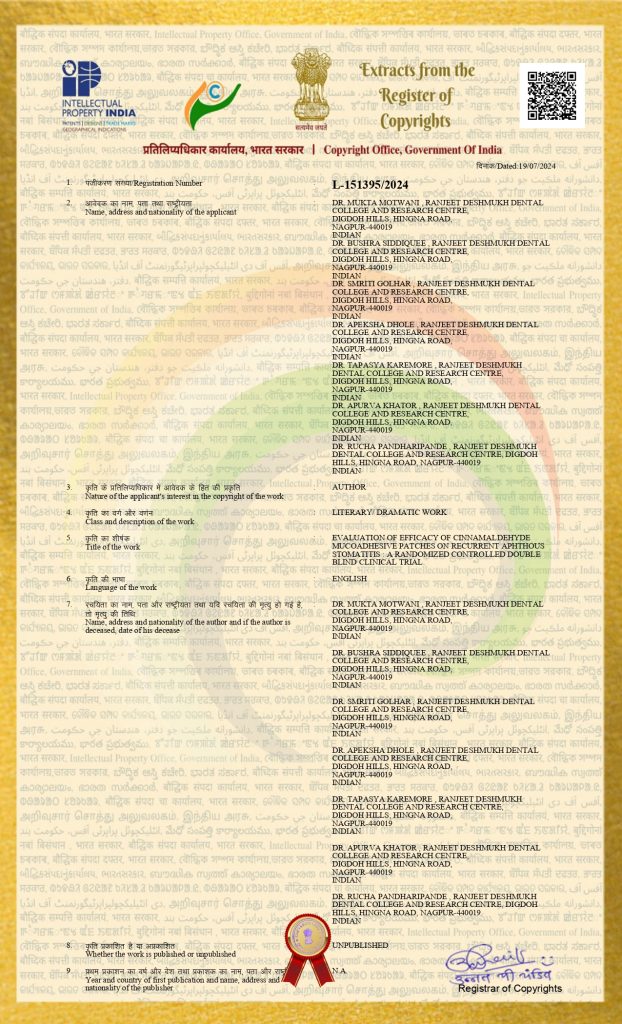Dr. Mukta Motwani, Professor & HOD, Dr. Bushra Siddiquee, MDS 3rd year, Dr. Smriti Golhar, Reader, Dr. Apeksha Dhole, Professor, Dr. Tapasya Karemore, Reader, Dr. Zareesh Akhtar, Senior Lecturer, Dr. Rucha Pandharipande, Senior Lecturer, Department of Oral Medicine & Radiology, Ranjeet Deshmukh Dental College & Research Centre, Nagpur received copyright L-151395/2024 dated on 19/07/2024 of titled ‘Evaluation of Efficacy of Cinnamaldehyde Mucoadhesive Patches on Recurrent Aphthous Stomatitis: A Randomized Controlled Double Blind Clinical Trial.’