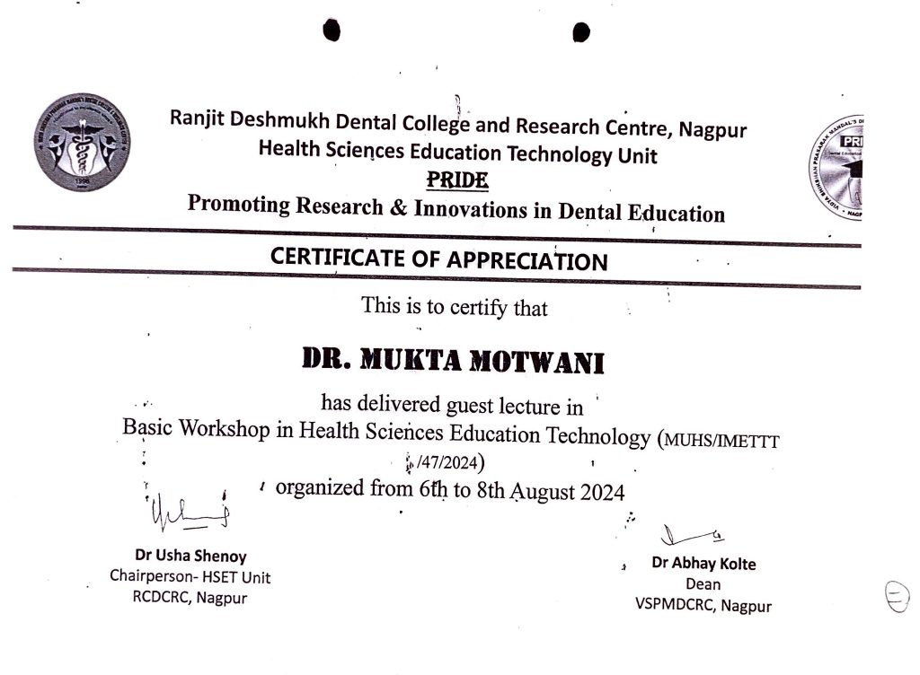 Dr. Mukta Motwani, Professor & HOD, Department of Oral Medicine & Radiology, Ranjeet Deshmukh Dental College & Research Centre, Nagpur delivered Guest lecture in Basic Workshop in Health Sciences Education Technology at RD DC & RC, Nagpur by HSET Unit on 6th to 8th August 2024.