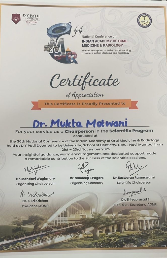 Dr. Mukta Motwani, Professor & HOD, Department of Oral Medicine & Radiology, Ranjeet Deshmukh Dental College & Research Centre, Nagpur was a Chairperson in Scientific Program – 36th National Conference of the Indian Academy of Oral Medicine & Radiology at D Y Patil Deemed to be University, School of Dentistry, Nerul, Navi Mumbai from 21st to 23rd November 2025.