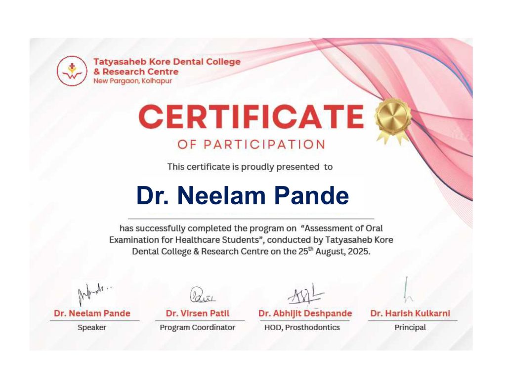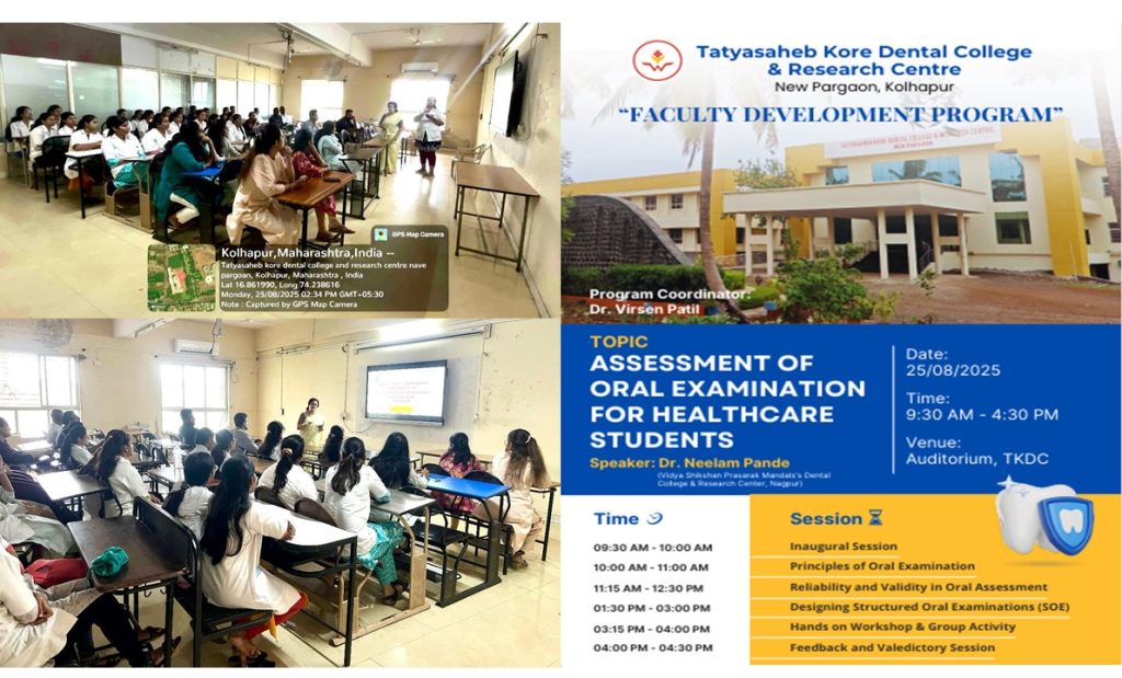 Dr. Neelam Pande, HOD, Prof., Ph.D. & P.G. Guide, Department of Prosthodontics, Ranjeet Deshmukh Dental College & Research Centre, Nagpur invited as ‘Guest Speaker’ to conduct a Full day ‘Faculty Development Program: Assessment of Oral Examination for Healthcare Students’ on topics: “Principles of Oral Examination, Reliability and Validity in Oral Assessment, Designing Structured Oral Examinations (SOE), Hands on Workshop & Group Activity” organized by Tatyasaheb Kore Dental College & Research Centre, New Pargaon, Kolhapur on 25th August 2025.