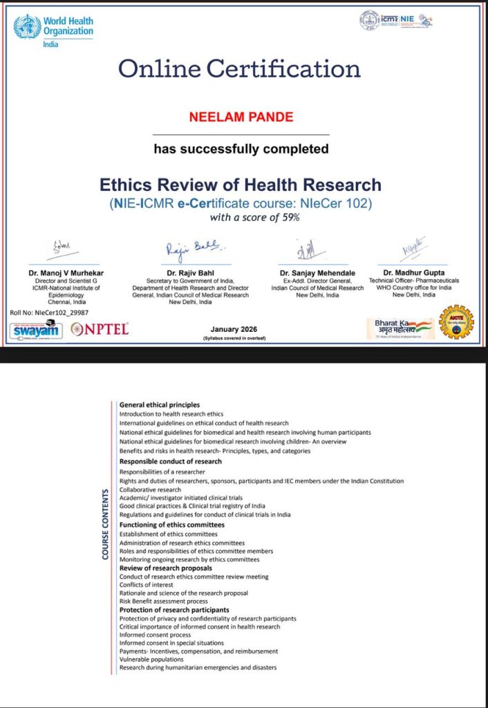 Dr. Neelam Pande, HOD, Prof., Ph.D. & P.G. Guide, Department of Prosthodontics, Ranjeet Deshmukh Dental College & Research Centre, Nagpur successfully completed NPTEL NIE-ICMR and WHO India e-certificate course on ‘Ethics Review of Health Research’: NIeCer 102 from SWAYAM- a Government of India portal supported by the Ministry of Education in January 2026.