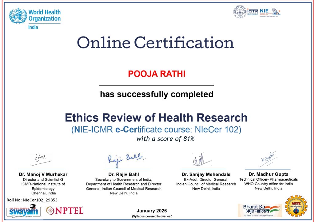 Dr. Pooja Rathi, Lecturer, Dept. of Pediatric and Preventive Dentistry, Ranjeet Deshmukh Dental College and Research Centre, Nagpur successfully completed the ICMR-NIE online course on ‘Ethics Review of Health Research’ from SWAYAM – a Government of India portal supported by the Ministry of Education in January 2026.