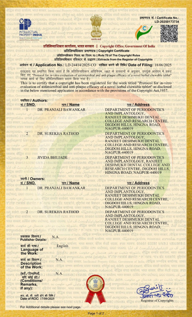 Dr. Pranjali Bawankar, Assistant Professor, Dr. Surekha Rathod, Professor, Ms, Jivida Bhujade, Intern and Ms. Siddhi Badhule, Intern, Department of Periodontics and Implant Dentistry, Ranjeet Deshmukh Dental College And Research Centre, Nagpur received a Copyright from the Copyright Office, Government of India for Literary work titled: “Questionnaire for evaluation of antiplaque effect of a novel chewable tablet containing orange peel extract and syzygium cumini.” (Registration No. LD-20250173734) on 17th September 2025.