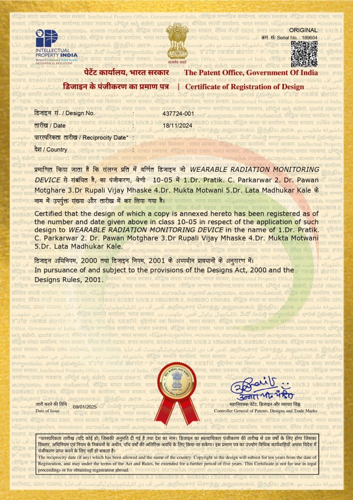 Patent has been granted to the patentee, Dr. Pratik Parkarwar Dr. Pawan Motghare Dr. Rupali Mhaske Dr. Mukta Motwani & Dr. Lata Kale Device Design titled: ‘Wearable Radiation Monitoring Device’ from The Patent Office, Government of India 437724-001 dated on 9/01/2025