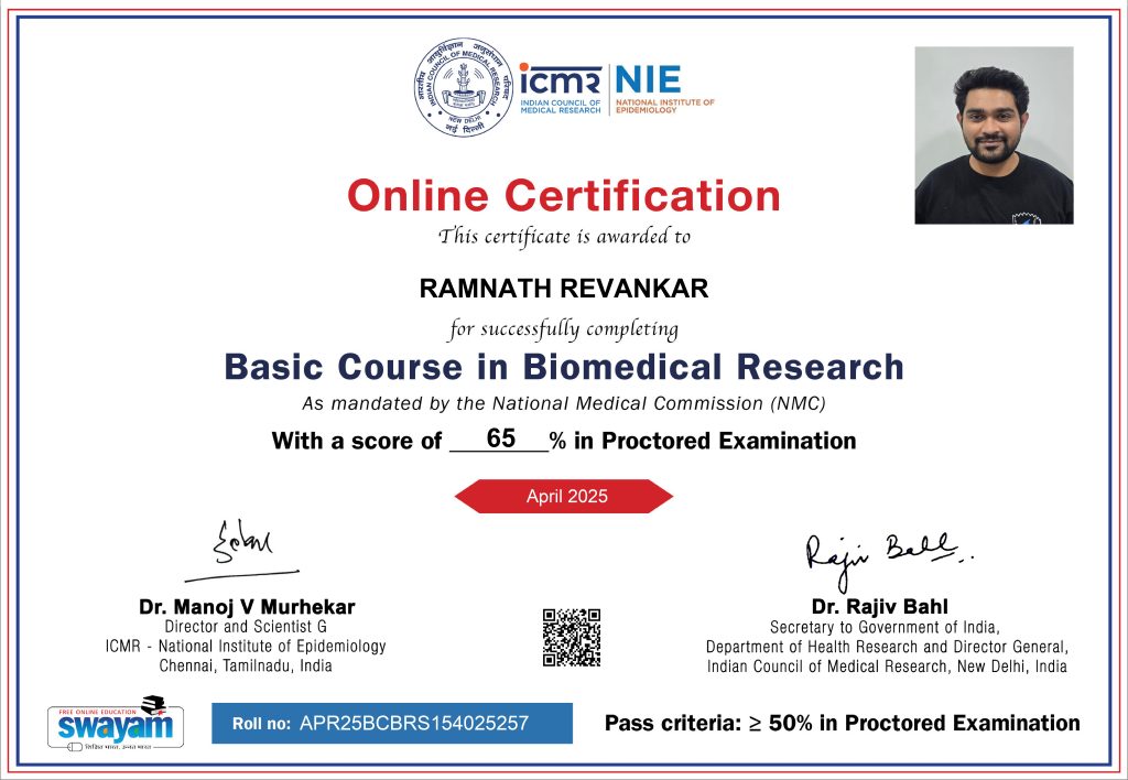 Dr. Ramnath Revankar, Sr. Lecturer, Dept. of Prosthodontics, Ranjeet Deshmukh Dental College & Research Centre, Nagpur successfully completed NPTEL ICMR-NIE ‘Basic Course in Biomedical Research’ from SWAYAM – a Government of India portal supported by Ministry of Education on 13th April 2025.
