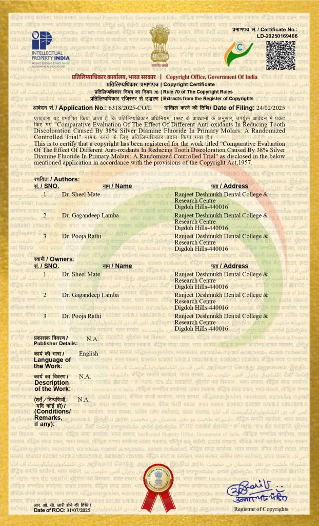 Dr. Sheel Mate, Third Year MDS Student, Dr. Gagandeep Lamba, Reader, P.G. Guide and Dr. Pooja Rathi , Lecturer, Department of Pediatric and Preventive Dentistry, Ranjeet Deshmukh Dental College And Research Centre, Nagpur received a Copyright from the Copyright Office, Government of India for Literary work titled: ‘ Comparative Evaluation Of The Effect Of Different Anti-oxidants In Reducing Tooth Discoloration Caused By 38% Silver Diamine Fluoride In Primary Molars: A Randomized Controlled Trial ‘ (Registration No.  LD-20250169406) on 31st July 2025