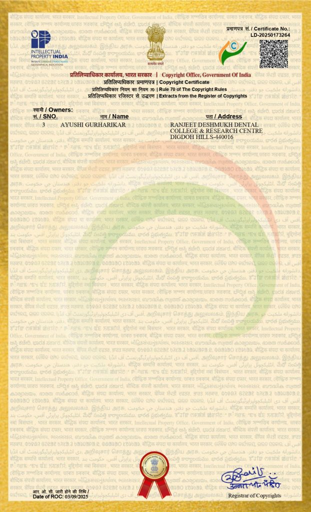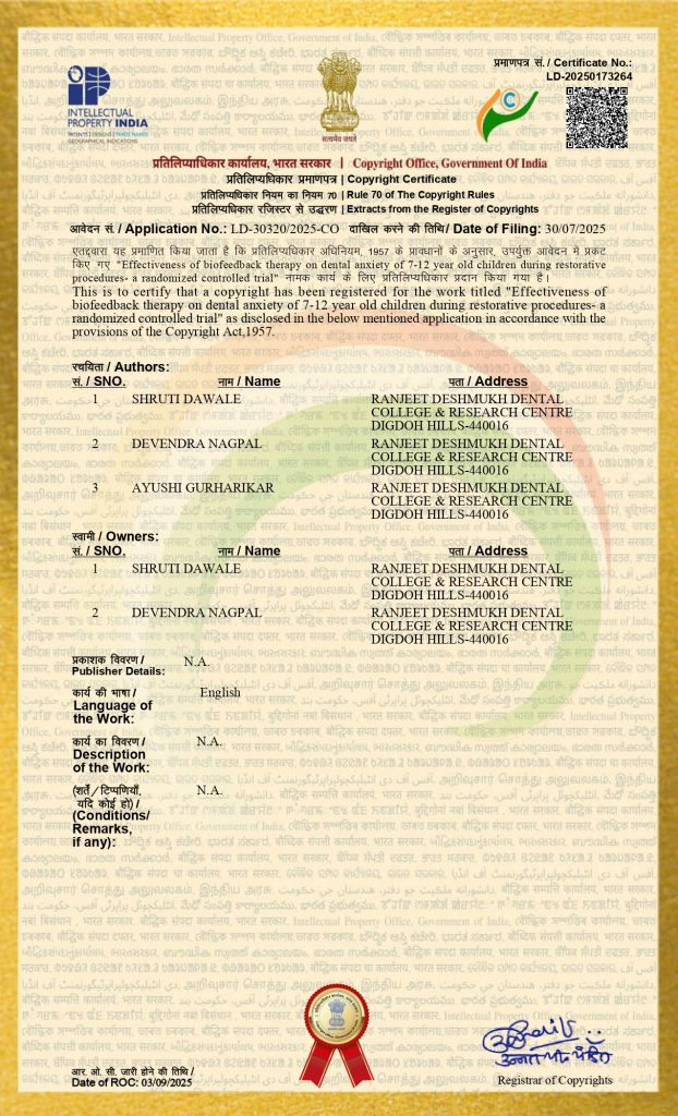 Dr. Shruti Dawale, Third Year MDS Student, Dr. Devendra Nagpal, HOD, Professor, P.G. Guide and Dr. Ayushi Gurharikar , Lecturer, Department of Pediatric and Preventive Dentistry, Ranjeet Deshmukh Dental College And Research Centre, Nagpur received a Copyright from the Copyright Office, Government of India for Literary work titled: ‘ Effectiveness of biofeedback therapy on dental anxiety of 7-12 year old children during restorative procedures- a randomized controlled trial ‘ (Registration No. LD-20250173264) on 3rd September 2025