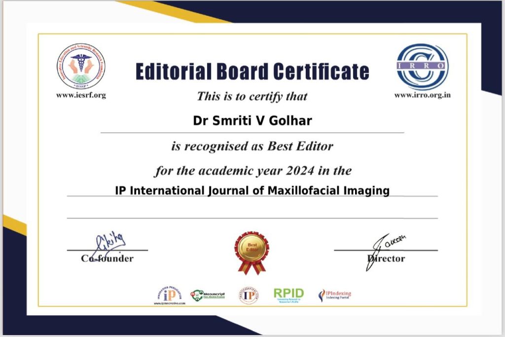 Dr. Smriti Golhar, Reader, Department of Oral Medicine & Radiology, Ranjeet Deshmukh Dental College & Research Centre, Nagpur recognised as Best Editor for the academic year 2024 in the IP International Journal of Maxillofacial Imaging.