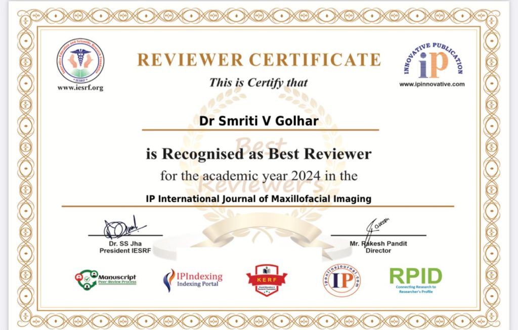 Best Reviewer for the academic year 2024 in IP International Journal of