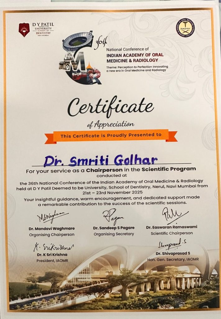 Dr. Smriti Golhar, Reader, Department of Oral Medicine & Radiology, Ranjeet Deshmukh Dental College & Research Centre, Nagpur was a Chairperson in Scientific Program – 36th National Conference of the Indian Academy of Oral Medicine & Radiology at D Y Patil Deemed to be University, School of Dentistry, Nerul, Navi Mumbai from 21st to 23rd November 2025.