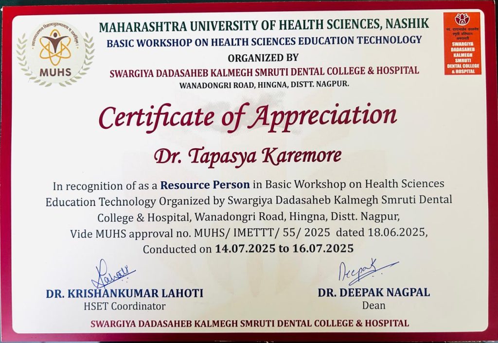 Dr. Tapasya Karemore, Reader, Department of Oral Medicine & Radiology, Ranjeet Deshmukh Dental College & Research Centre, Nagpur was Resource person in Basic Workshop in Health Sciences Education Technology oganised by Swargiya Dadasaheb Kalmeght Smruti Dental College & Hospital Wanadongri Road, Hingna, Nagpur on 14th to 16th July 2025.
