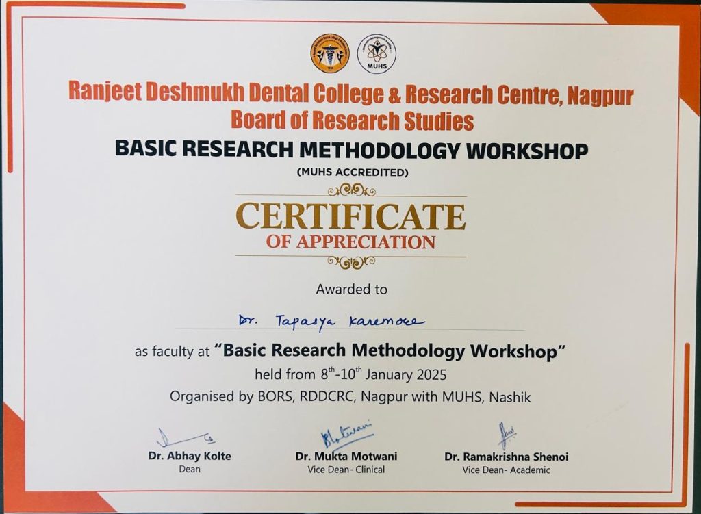 Dr. Tapasya Karemore, Reader, Dept. of Oral Medicine & Radiology, Ranjeet Deshmukh Dental College and Research Centre, Nagpur was Faculty at ‘MUHS Basic Research Methodology Workshop’ organized by BORS, Ranjeet Deshmukh Dental College & Research Centre, Nagpur on 8th to 10th January 2025.