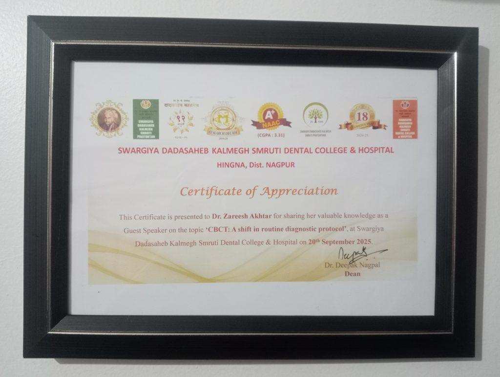 Dr. Zareesh Akhtar, Senior Lecturer, Department of Oral Medicine & Radiology, Ranjeet Deshmukh Dental College & Research Centre, Nagpur was Guest Speaker on the Topic – ‘CBCT: A shift in routine diagnostic protocol’ at Swargiya Dadasaheb Kalmeght Smruti Dental College & Hospital, Nagpur on 20th September 2025.